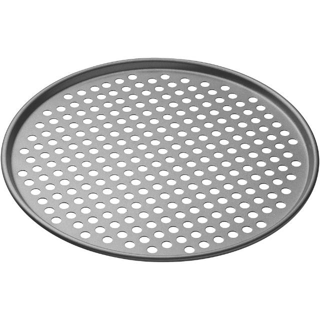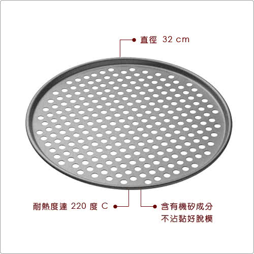 本商品一件入、耐熱度 220 度C,適用烤箱、冷藏冷凍與洗碗機;系列烤盤內層的不沾雙塗層中,含有有機矽成分可幫助脫模減少沾黏(烤盤上請勿使用尖銳刀叉,避免破壞塗層),絕不含 BPA、PFOA 以及 PTFE 有害物質,且屢獲國際獎項肯定,讓您使用更安心。團聚過節或一起觀看運動賽事時,來片披薩暢飲汽水,多麼令人開心歡樂;喜愛披薩的您,也不容錯過此烤盤。直徑 12 吋半搭配不沾黏平滑塗層,可輕鬆自製美味披薩。且盤底具孔洞設計,烘烤時披薩底部多餘的熱氣可以輔助排出,保持底皮的酥脆;亦可用來烘烤地瓜薯條或馬鈴薯洋芋片等點心。不沾黏特性好脫模讓您烤後方便快速享用,表面噴砂處理更耐用、搭配圓潤的弧邊好拿握不割手,輕鬆享受美好時光。